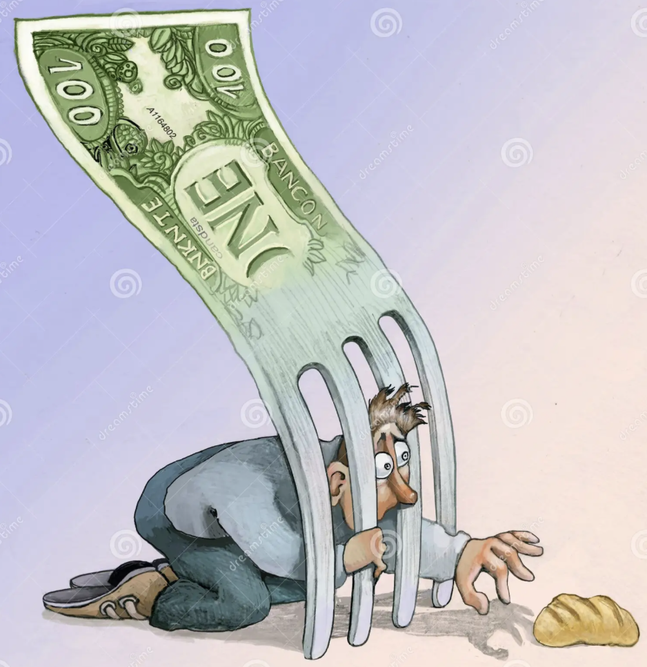 Examina el contexto económico que podría estar representando esta imagen. ¿Qué crítica podría estar haciendo el artista?