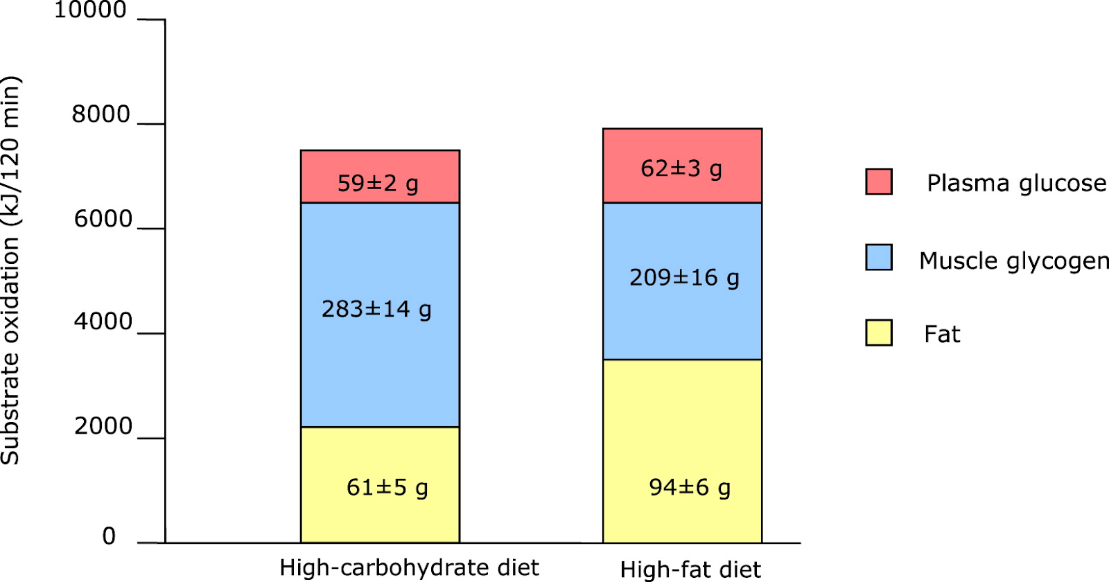 Athletes completed 120 minutes of cycling at 70% VO₂max after following a high-carbohydrate or high-fat diet for 5 days. Figure 1 shows the estimated contribution of fat, muscle glycogen, and plasma glucose oxidation in each condition.