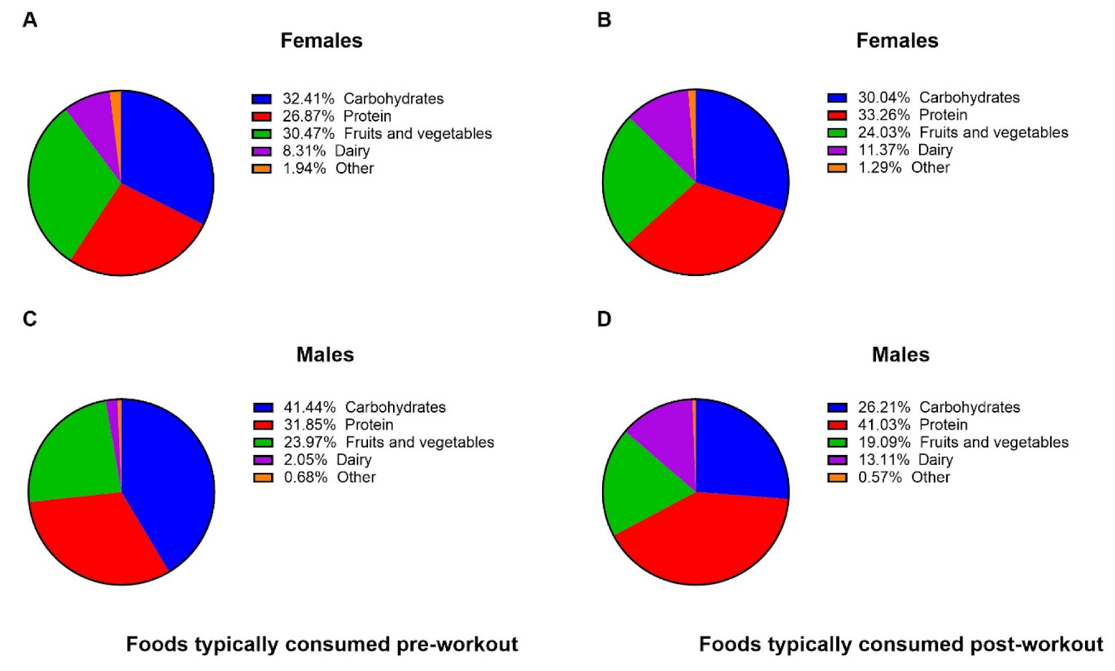 A survey was conducted on athletes' nutritional habits before and after workouts. Participants reported all food types they typically consumed, categorized as carbohydrates, protein, fruits and vegetables, dairy, and other. Data were analyzed separately by sex and workout timing (pre vs. post).
