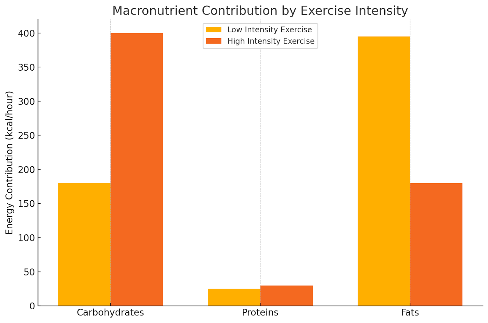 In a separate trial, Figure 2 compares the hourly energy contribution (kcal/hour) of carbohydrates, proteins, and fats during low- and high-intensity exercise.