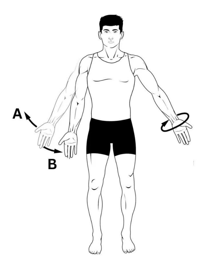 Which of the following correctly identifies the labeled arm movements A and B and the anatomical plane in which they occur?