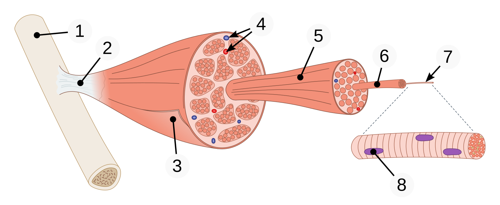 Based on the diagram and your understanding of training adaptations, which structure is most likely to exhibit increased collagen cross-linking and tensile strength after consistent resistance training?