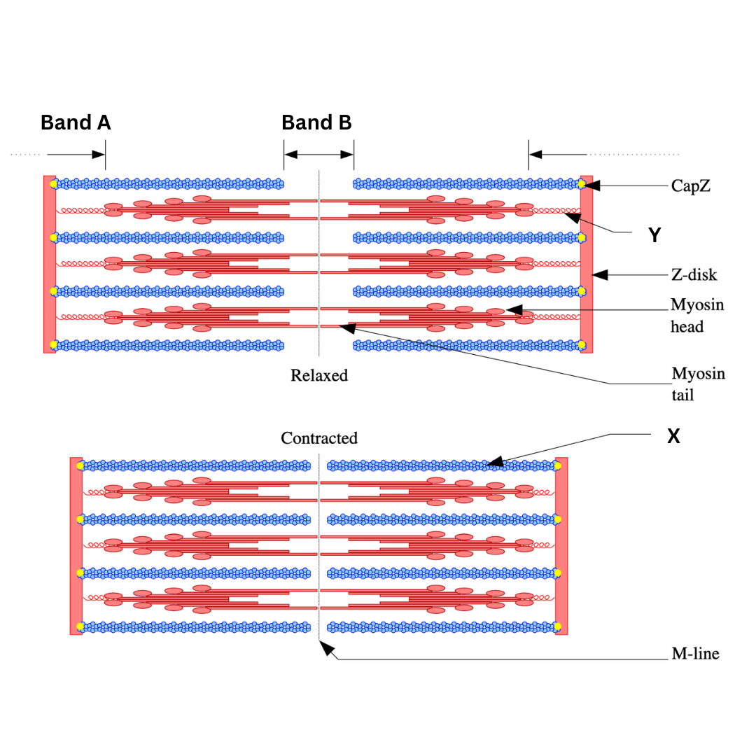 What change occurs to Band B and structure X when the muscle contracts, as shown in the image?
