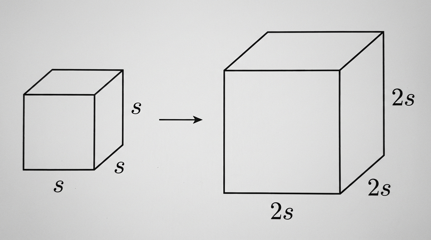 If a cubic cell's width doubles, the surface area increases by times, but the volume increases by __________ times.
