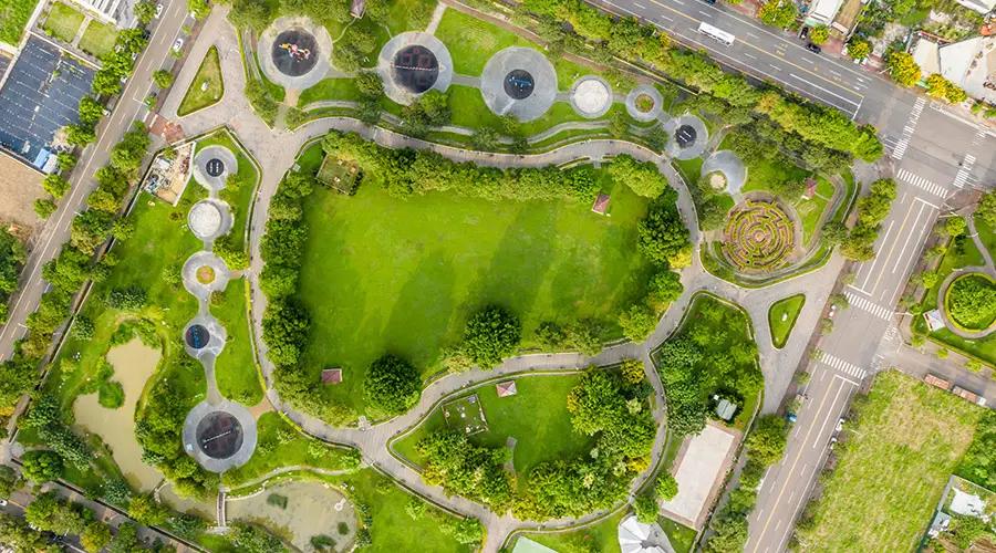 True or False: Urban green spaces like the ones shown help mitigate the 'urban heat island' effect through shading and evapotranspiration.