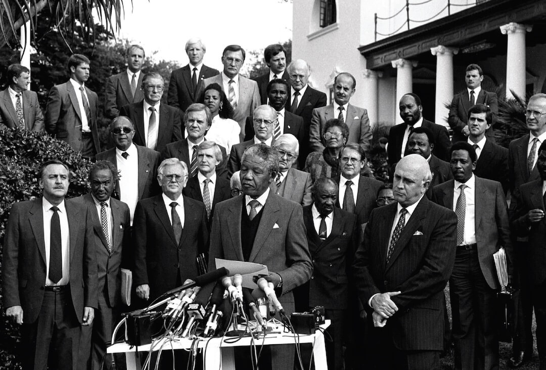 What type of government response is best illustrated by the image above showing negotiations between Nelson Mandela and F.W. de Klerk?