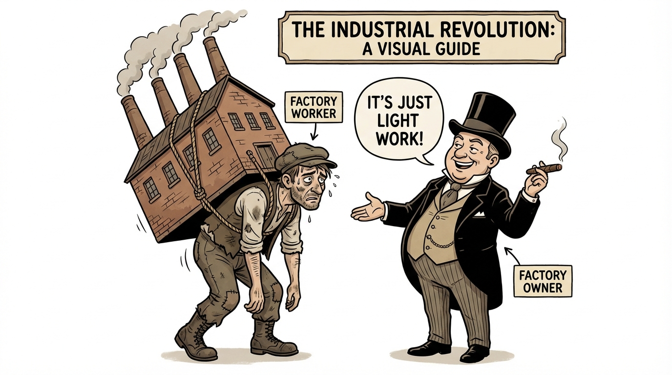 Based on the image shown, what is the humorous point being made about factory work during industrialisation?