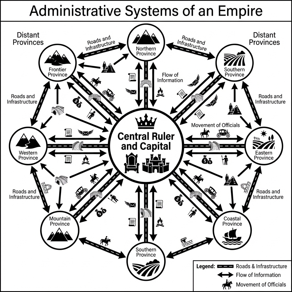 Based on the provided diagram of the interconnected administrative systems of an empire, how do infrastructure and communication networks support the central ruler?