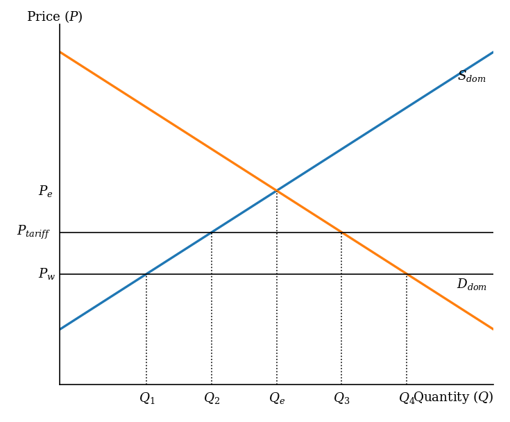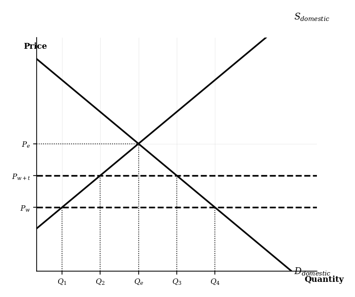 When a country moves from no trade (autarky) to free trade, the quantity demanded by domestic consumers increases from to: