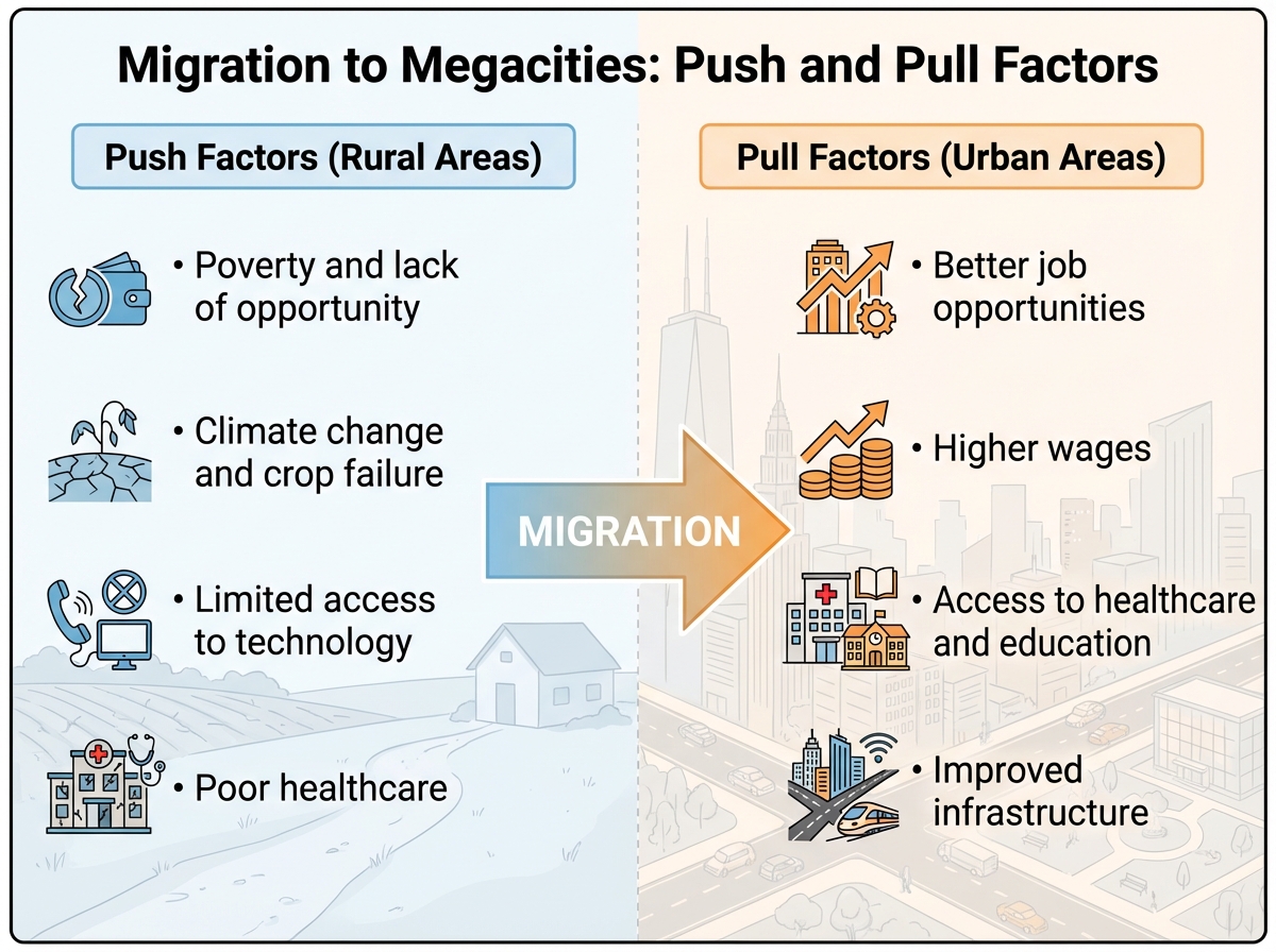 Referencing the image below, which of these is identified as a 'pull factor' that attracts people to megacities?