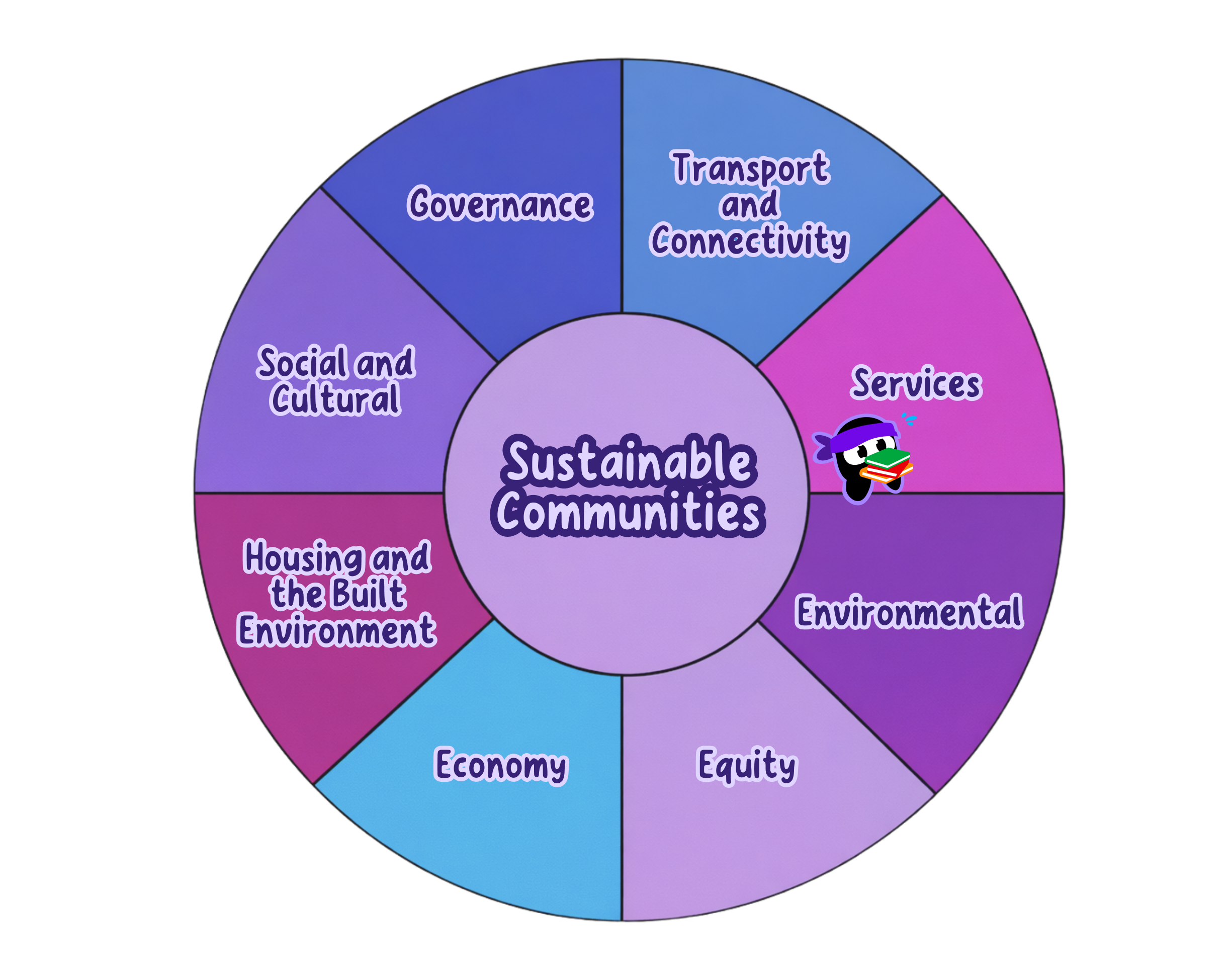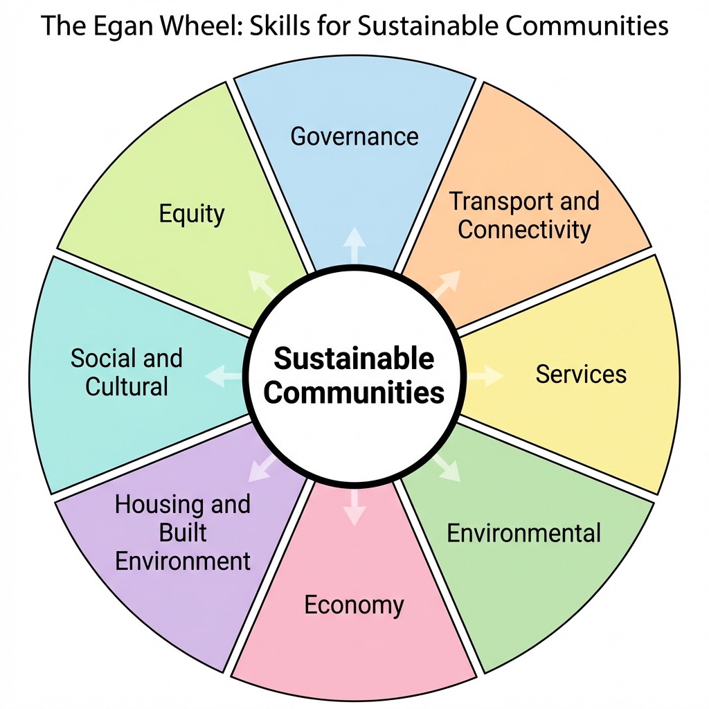 In the Egan Wheel framework shown below, which component would most likely be evaluated using the indicator 'access to health care and schools'?