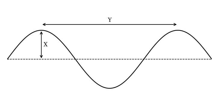 The diagram shows a snapshot of a wave on a string. Five consecutive crests are shown.